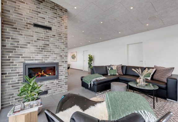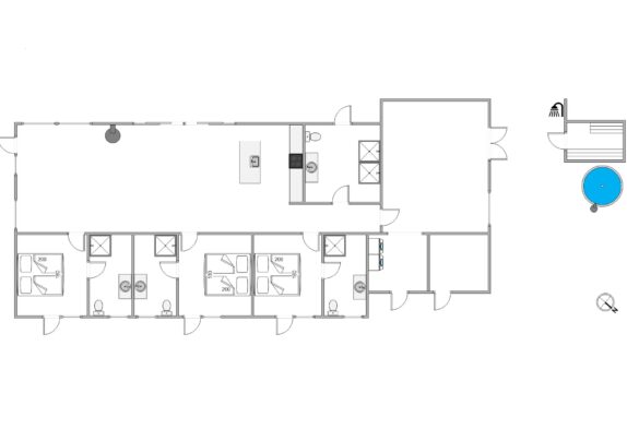 Ud over de 3 badeværelser i forlængelse af soveværelserne rummer sommerhuset desuden et ekstra badeværelse med dobbeltbruser. De i alt 4 badeværelser er selvfølgelig alle udstyret med gulvvarme, ligesom der er gulvvarme i opholdsrummet.