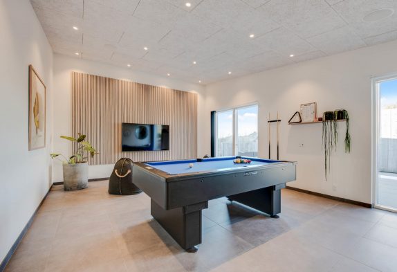 Indenfor finder I et aktivitetsrum med billardbord, og der er bluetooth-højtaler indbygget i loftet.