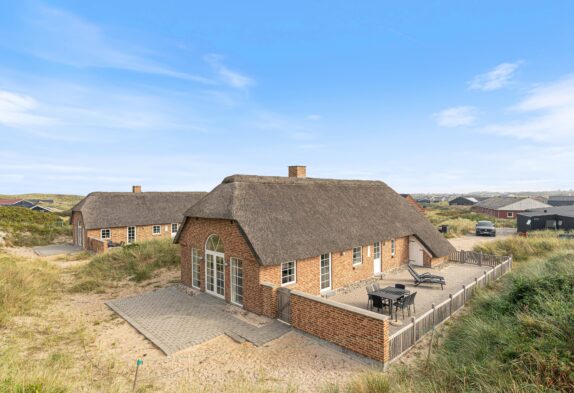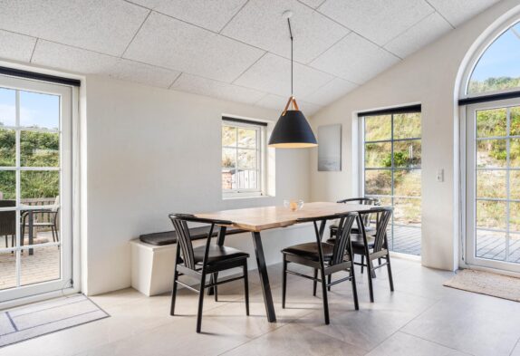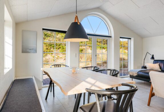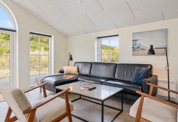 De store vinduer i stuen giver et flot lysindfald, og udsigten til klitterne kan blandt andet nydes gennem det store vestvendte vinduesparti, hvor der også er lagt op til muligheden for at nyde de fantastisk smukke solnedgange. Fra stuen er der udgang til både en sydvendt og vestvendt fliseterrasse, og med sommerhusets skønne beliggenhed i første klitrække er havets brusen også inden for hørevidde.