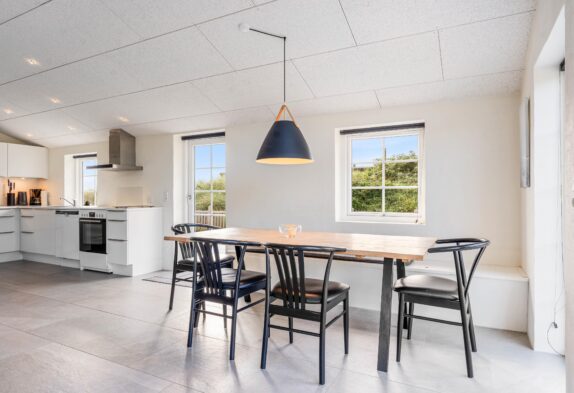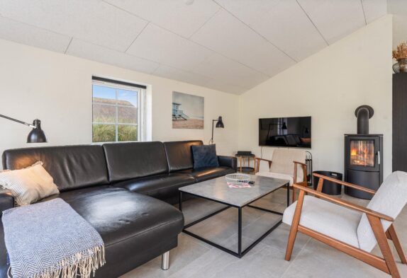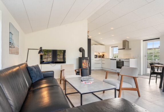 Det moderne feriehus er godt indrettet med åbent køkken i forbindelse med stuen. Det moderne køkken er selvfølgelig udstyret med opvaskemaskine og mikroovn, og det bliver en ren fornøjelse for feriens kok at tilberede dagens måltider. I både køkken og stue er der flot klinkegulv med gulvvarme, der giver en behagelig temperatur. Og om det så bare skulle være for hyggens skyld, kan der tændes op i brændeovnen, der er centralt placeret i rummet.