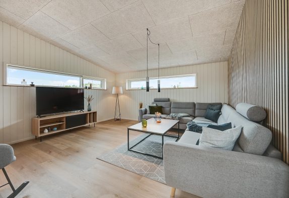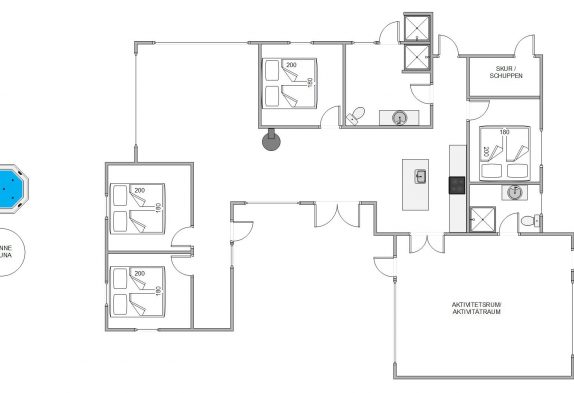 Aktivitetshuset er opført i 2021, og den stilfulde indretning med moderne interiør opfylder selv den mest kræsne feriegæsts drømme. De fire soveværelser er alle sammen udstyret med gode dobbeltsenge (180×200), og med 2 badeværelser er I sikre på at slippe for lange køer til brusebadet om morgenen.