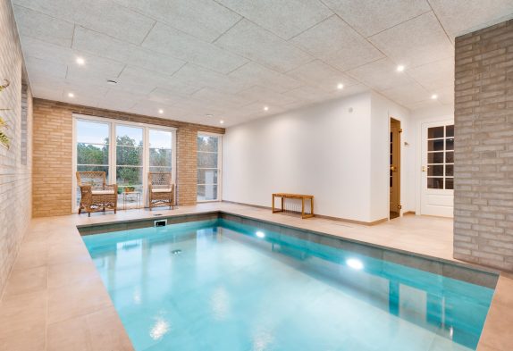 I den ene del af feriehuset, venter poolen på familiens vandhunde, mens saunaen indbyder til afslapning. Her kan der tilbringes mange timer med hygge og leg for alle aldre.