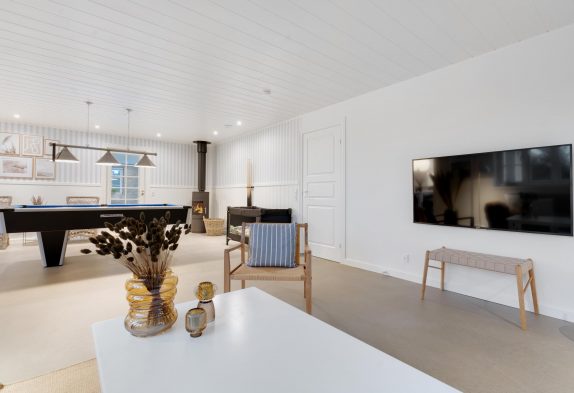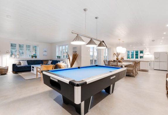 Feriehuset er indrettet med store lyse rum med masser af plads til familiehygge. Brug aftenerne med et brætspil ved spisebordet, eller en lille turnering omkring billardbordet, alt imens brændeovnen knitrer henne i hjørnet. Hvem ved – måske ender du som billardmester?