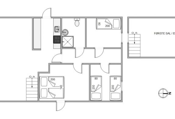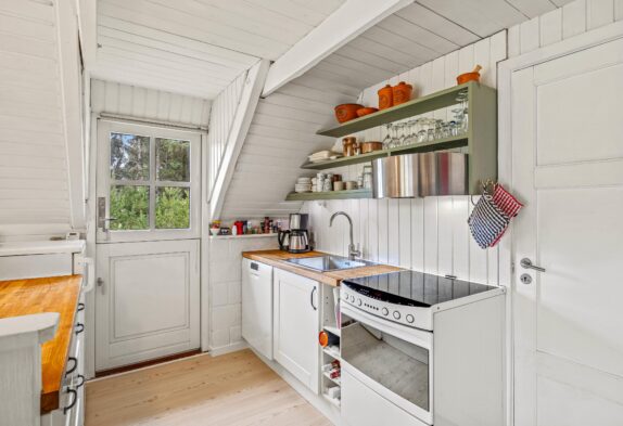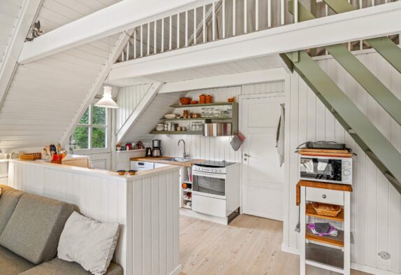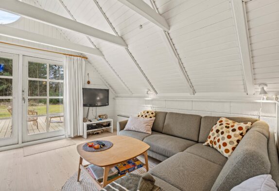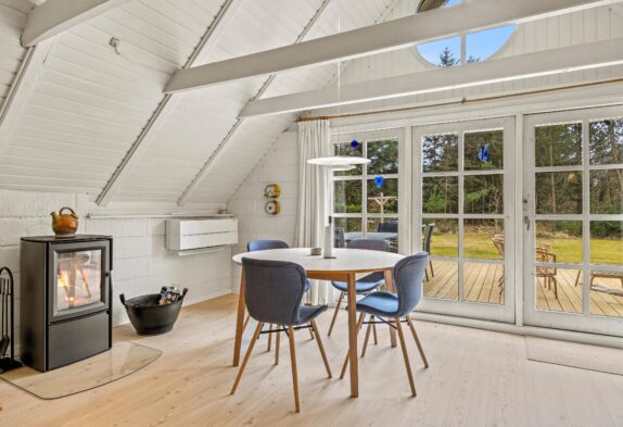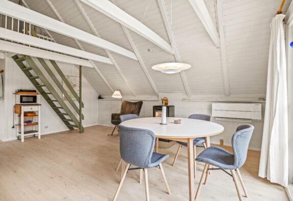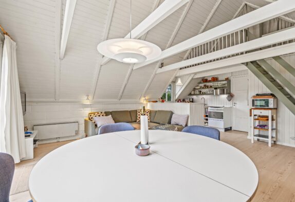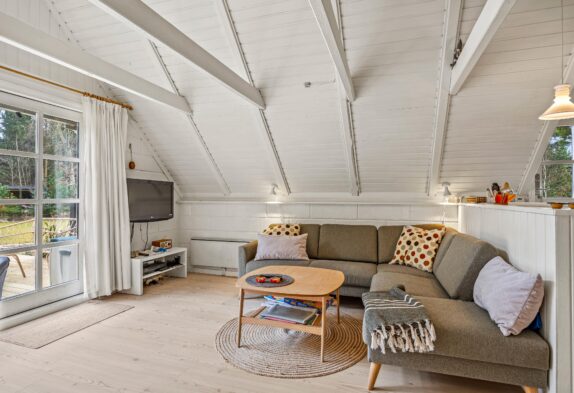 Sommerhuset er hyggeligt indrettet, og det er oplagt til hygge og socialt samvær med familien. Feriehuset har kombineret stue, køkken og spisestue, så hele familien kan være med, når der laves mad, ses film eller spilles brætspil foran brændeovnen. Når børnene skal have fred til at lege, kan de kravle op på sommerhusets hyggelige hems, hvor der er god plads til dem at lege på.