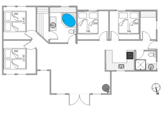 Sommerhuset er udstyret med 4 soveværelser med dobbeltsenge og garderobeskabe, så alle har sit eget hyggelige rum. De 2 badeværelser med gulvvarme tilføjer ekstra komfort, og det ene badeværelse er indrettet med både spabad og sauna for ultimativ afslapning og forkælelse.
