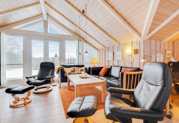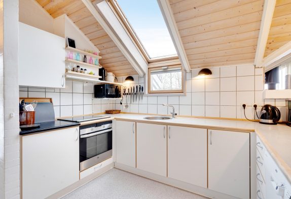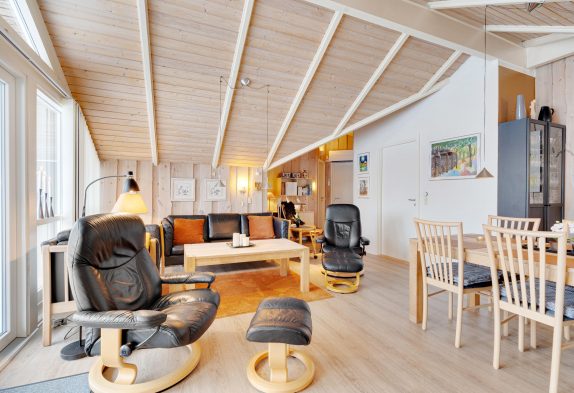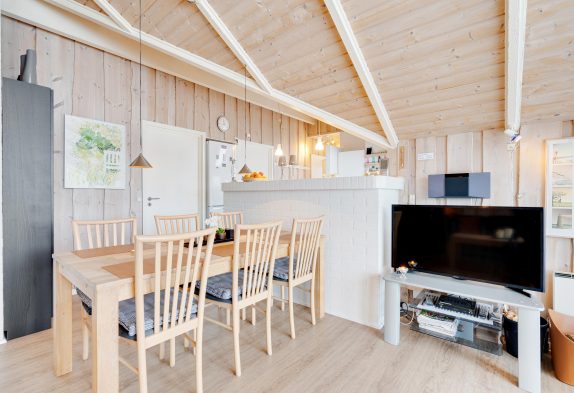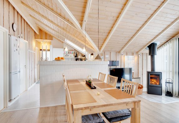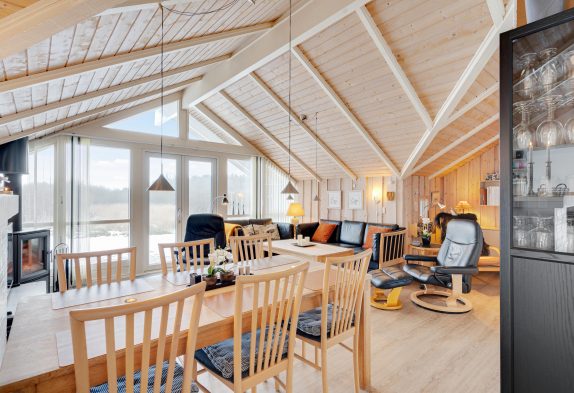 Sommerhuset byder jer velkommen med en hyggelig indretning, der skaber en hjemlig atmosfære fra første øjeblik. Opholdsstuen, med sit imponerende loft til kip, er det perfekte sted at samles til uforglemmelige feriestunder. Her kan I tænde op i brændeovnen og lade jer synke ned i sofaen med en spændende film eller et sjovt spil. Køkkenet er designet til at være samlingspunkt under madlavningen, og de skønne retter kan nydes ved spisebordet, mens I planlægger jeres næste oplevelser.