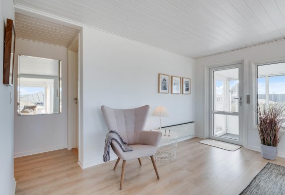 Et ekstra charmerende spot er den lille udestue. Her får I mulighed for at nyde den vestjyske natur i al slags vejr, og eftermiddagskaffen bliver kun endnu mere hyggelig af, at regnen trommer på ruden.