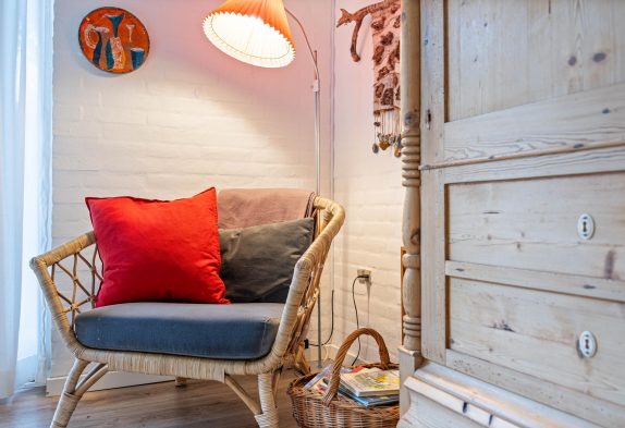 I stuen er brændeovnen centralt placeret, så om I samles omkring spisebordet, i sofaen eller nyder den smukke udsigt gennem stuens panoramavinduer, kan I gøre det i det gyldne skær og den knitrende lyd fra brændeovnen.