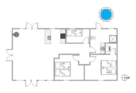 De 5 sovepladser fordeler sig på 3 værelser med henholdsvis 2 dobbeltsenge og 1 enkeltseng. Badeværelset med gulvvarme er praktisk placeret i samme ende af sommerhuset som værelserne, så om morgenen er der ikke langt fra sengen til et forfriskende brusebad, inden I tager hul på endnu en fantastisk dag ved Vesterhavet.