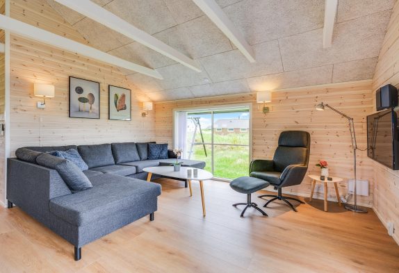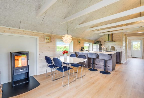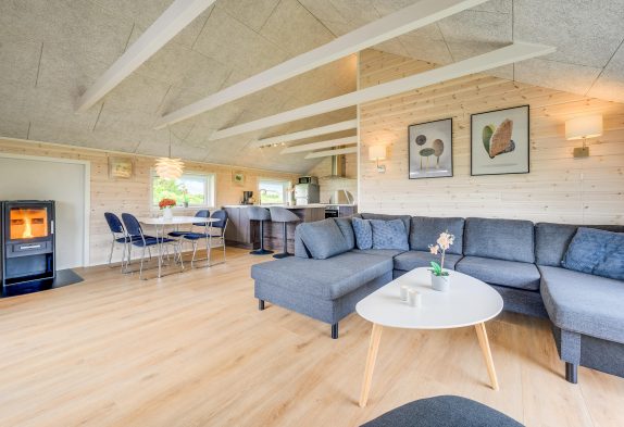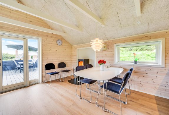 Fra alrummet har I udsigt til den flotte natur gennem store vinduesfronter på alle sider. I hjørnet står brændeovnen, som med sin knitrende ild altid er garanti for god feriestemning – både på en regnfuld dag med kortspil rundt om spisebordet og på en sen aften, hvor der slappes af på sofaen med en god bog og et glas rødvin.