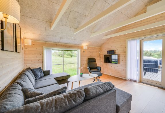 Fra stuen kommer I ud på feriehusets overdækkede terrasse, der er helt lukket af. Her finder I også et af feriens højdepunkter, det store vildmarksbad. En afslappende stund i det varme boblebad, mens fuglene kvidrer eller vinden rusker i trætoppene, er velvære på højt plan.