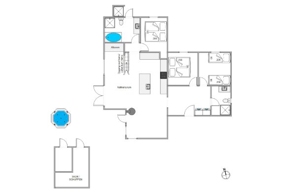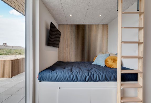 Alrummet er indrettet med en hyggelig alkove, der er et godt spot til en middagslur eller lidt afslapning med en god bog. Sommerhusets hems vil helt sikkert falde i god jord hos børnene, og så er samtlige 5 fjernsyn i ferieboligen udstyret med Chromecast samt Apple Airplay, så I har mulighed for at streame jeres yndlingsfilm og -serier. Der er også trådløse bluetooth højtalere op i stue og køkken.