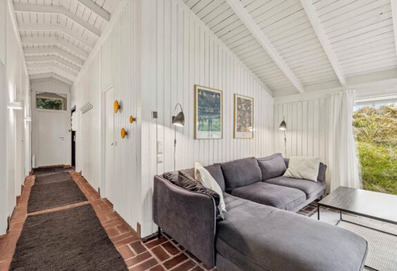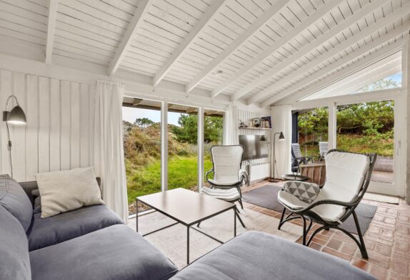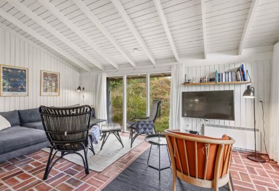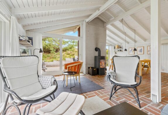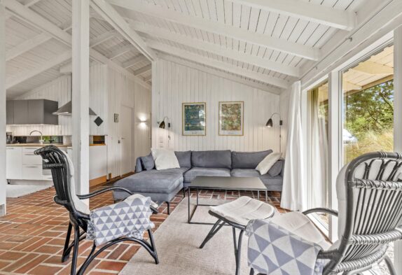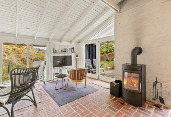 Feriehuset er indrettet i en charmerende stil med hvide trævægge, komfortabelt interiør og brændeovn, og omgivelserne emmer i det hele taget af klassisk sommerhusstemning. Gennem de mange vinduer, særligt i opholdsrummet, har I en skøn udsigt til den grønne natur, der omgiver jer – og samtidig er I sikret et godt lysindfald i sommerhusets fællesrum.