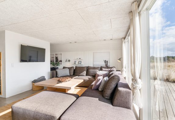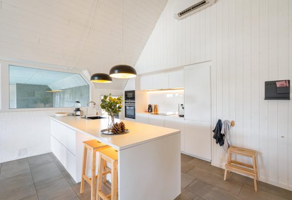 Det flotte, åbne køkkenalrum lægger op til mange timers samvær med gode snakke over køkkenets barområde – måske med et koldt glas hvidvin direkte fra vinkøleren? Sommerhusets sovepladser fordeler sig på fire gode soveværelser, alle med dobbeltseng og eget fjernsyn, mens de sidste sovepladser er at finde på hemsen. Fra hemsen kan I desuden skimte havet, som ligger kun 400 meter væk.