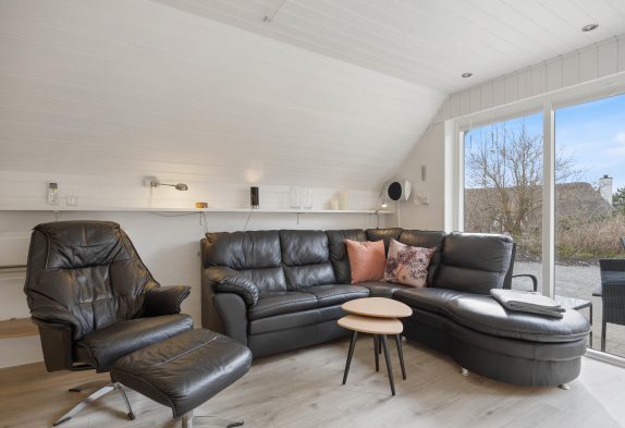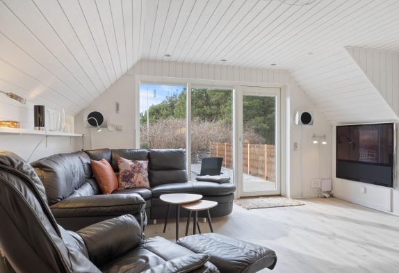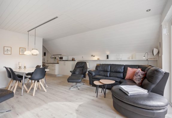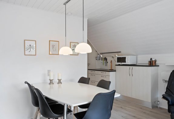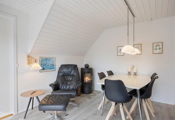 Opholdsrummet kommer uden tvivl til at danne ramme om en masse dejlige feriestunder. Rundt om spisebordet kan I planlægge morgendagens udflugter over en god middag, og på den komfortable sofa kan I smide benene opad og nyde feriefreden, mens brændeovnen knitrer i baggrunden.