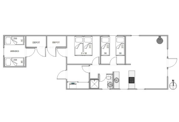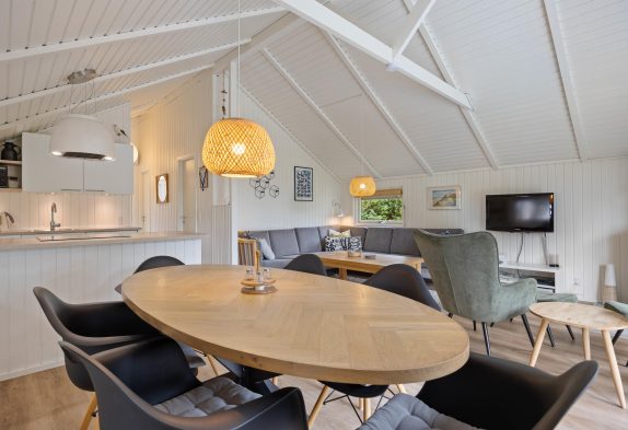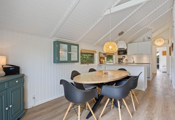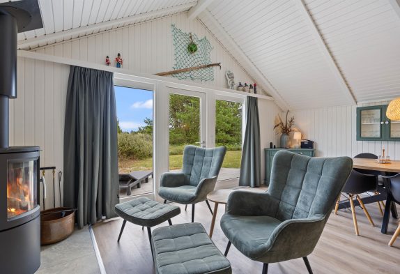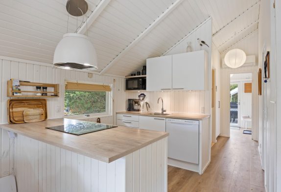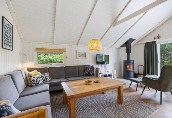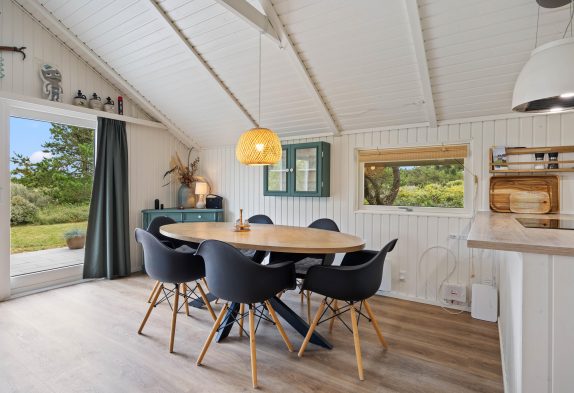Feriehusets hjerte er der indbydende alrum, der kombinerer køkken, spiseafdeling og stue i ét samlet rum. Alrummet kommer med garanti til at danne ramme om en masse hyggelige ferieminder med fælles madlavning, sene spilaftener og afslappende eftermiddage i den store hjørnesofa, mens brændeovnen knitrer i baggrunden.
