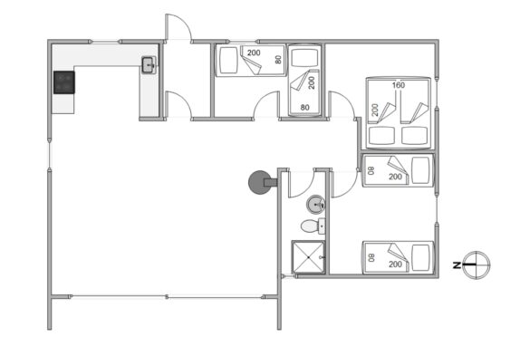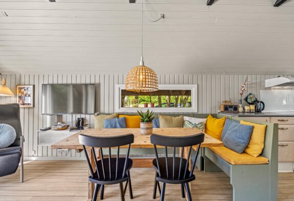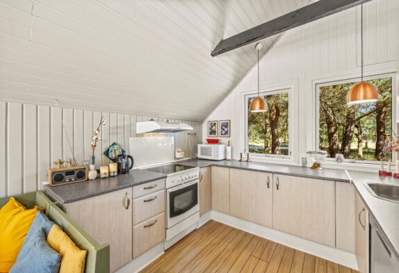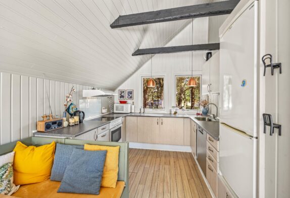 Ferieboligens hjerte er det åbne alrum, der forener det veludstyrede køkken, med opvaskemaskine, med spiseafdelingen og stuen. Centralt i rummet finder I brændeovnen, som altid er en garanti for afslappende feriestemning – og den knitrende ild er en behagelig form for baggrundsstøj, mens I spiser aftensmad eller planlægger morgendagens udflugter rundt om spisebordet.