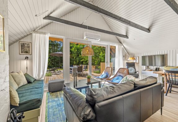 Sommerhuset er også udstyret med en energivenlig varmepumpe, som sikrer jer et godt rumklima hele året rundt, og på badeværelset er der gulvvarme. Sidst, men ikke mindst, får I her en hurtig og stabil internetforbindelse, så I kan streame alle jeres yndlingsfilm på den medbragte elektronik.