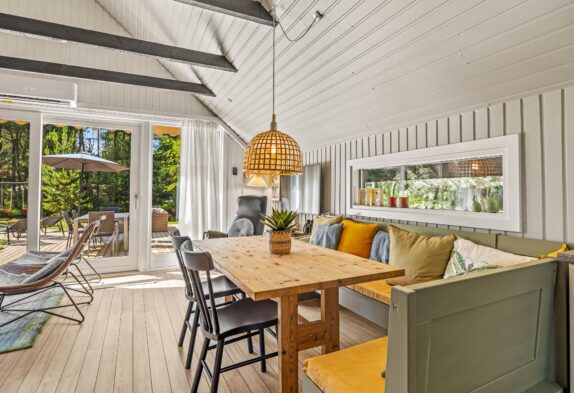 Fra alrummet er der udgang til feriehusets store træterrasse. Her finder I altid en læfyldt plads takket være den delvise afskærmning og overdækning. Hele den store plænegrund er omgivet af høje træer, så I har god ro til at nyde solen fra liggestolene eller spise en grillmiddag udenfor på en lun sommeraften.