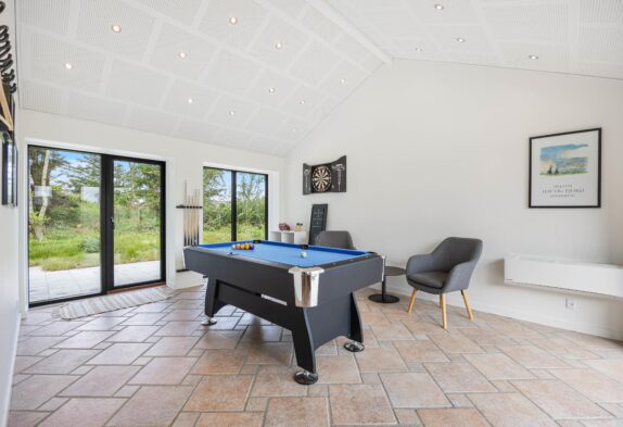 Hele opholdsrummet er stort, og med sommerhusets indretning gør det muligt at kombinere underholdning og afslapning. De aktive familiemedlemmer kan mødes til en spændende turnering ved billardbordet, mens dem, der foretrækker rendyrket afslapning, kan læne sig tilbage på sofaen med en god bog, mens ilden fra brændeovnen knitrer i baggrunden. Rundt omkring flere steder i huset er der masser af hyggekroge, hvor I kan læne jer tilbage og nyde noget afslapning.