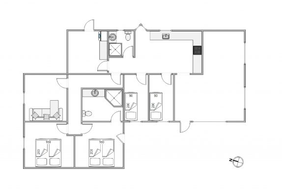 Feriehuset har i alt 5 soveværelser, hvor de 8 sovepladser fordeler sig på 2 dobbeltsenge, 2 enkeltsenge samt en sovesofa. Der er 2 badeværelser i sommerhuset – begge med gulvvarme. Desuden er der mulighed for at få vasket tøj under ferien, da der både er vaskemaskine og tørretumbler i sommerhuset.