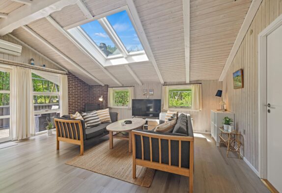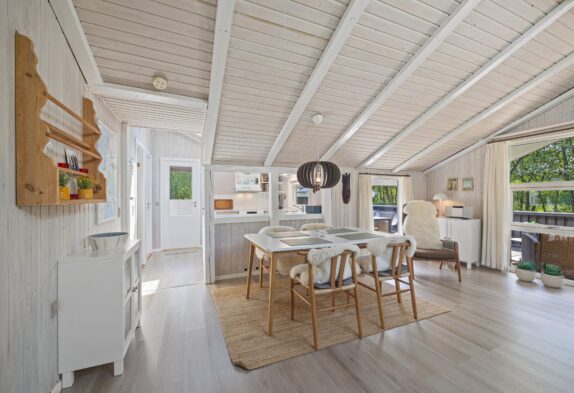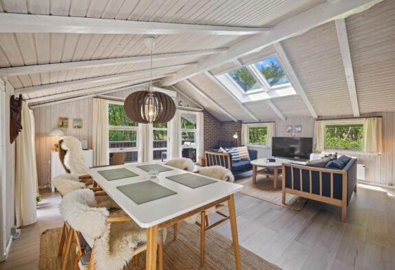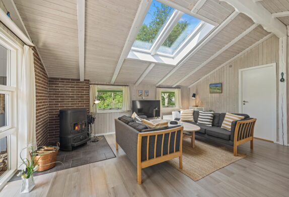 Sommerhusets hjerte er opholdsrummet. Her ligger køkkenet i åben forbindelse med stue og spiseafdeling, og der er på den måde skabt et samlet fællesrum, hvor I rigtigt kan sætte samværet i centrum og nyde feriedagene med hinanden. I stuehjørnet står brændeovnen, som altid er en ægte hyggespreder. Med en hurtig internetforbindelse og en Chromecast i stuen har I desuden alt, hvad I skal bruge for at arrangere en hyggelig filmaften i stuen.