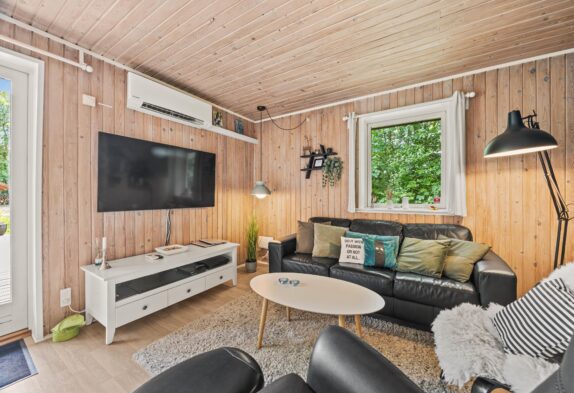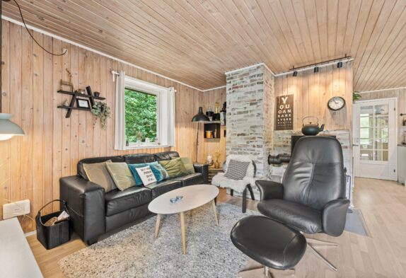 Når I træder ind i sommerhuset, bliver I mødt af en lys og hyggelig indretning med gode komfortable møbler.