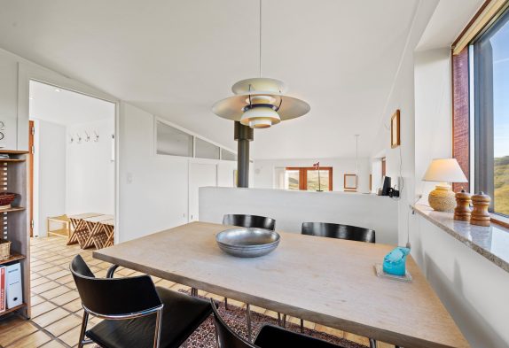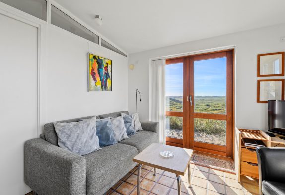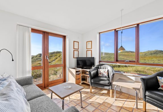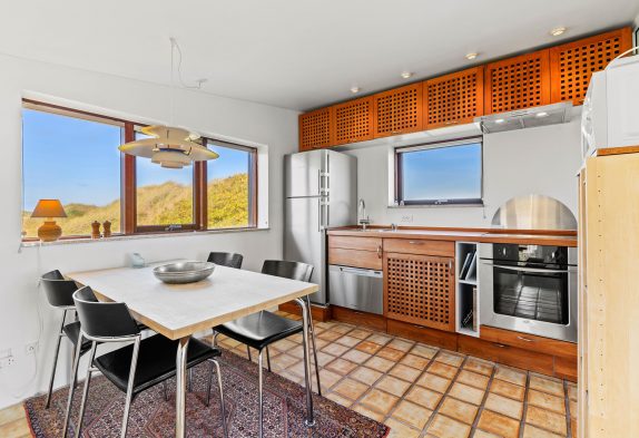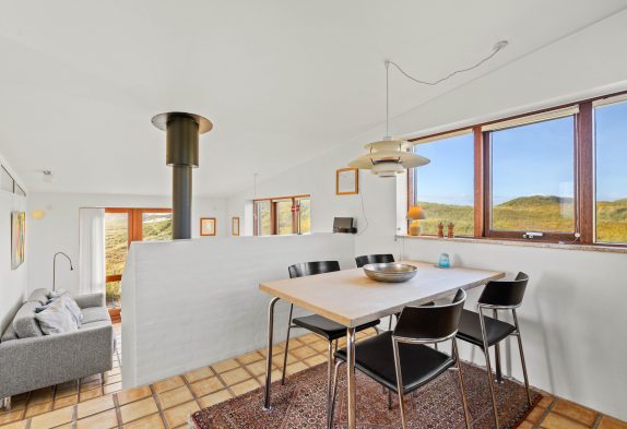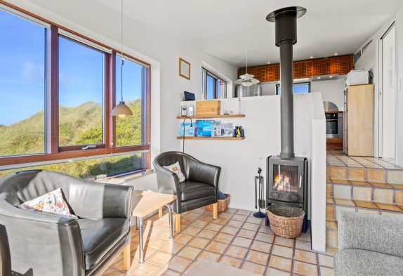 Når I træder ind i sommerhusets hyggelige køkken og stue, vil I blive mødt af den mest utrolige udsigt over det smukke klitlandskab. Uanset hvilket vindue I kigger ud af, vil I have mulighed for at se mod enten hav eller fjord. Derudover rummer sommerhuset en skøn brændeovn, hvor I kan varme jer på de kolde feriedage.