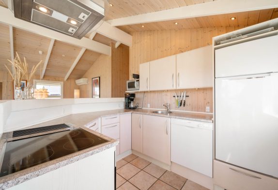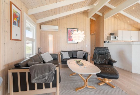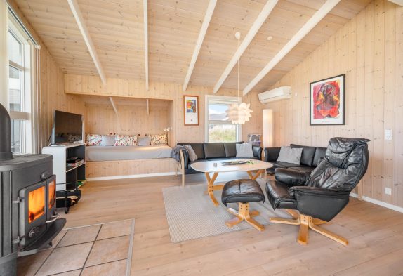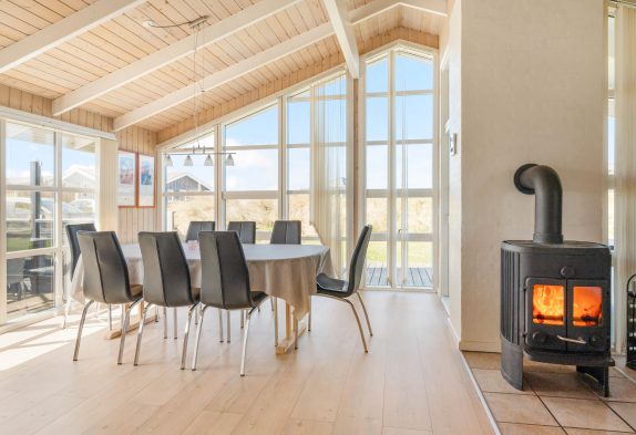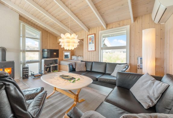 Sommerhusets opholdsstue er hjertet og samlingspunktet for feriens gæster. Her kan I sammen lave mad i køkkenet, spille spil omkring bordet og se gode film sammen i tv’et. En varmepumpe sørger for, at I altid har gode temperaturer, og på ægte sommerhusmanér står en brændeovn klar i stuen til at fuldende feriestemningen. Fra stuen har I desuden en skøn udsigt mod syd gennem de store vinduespartier.