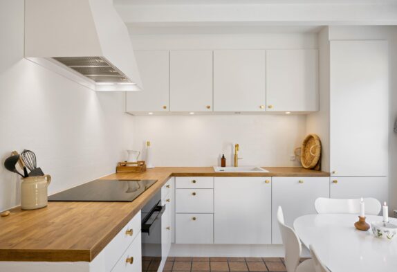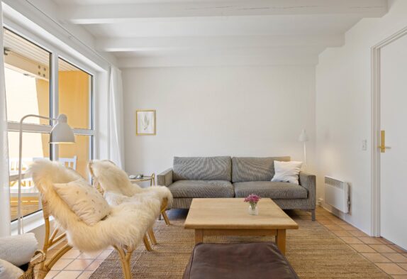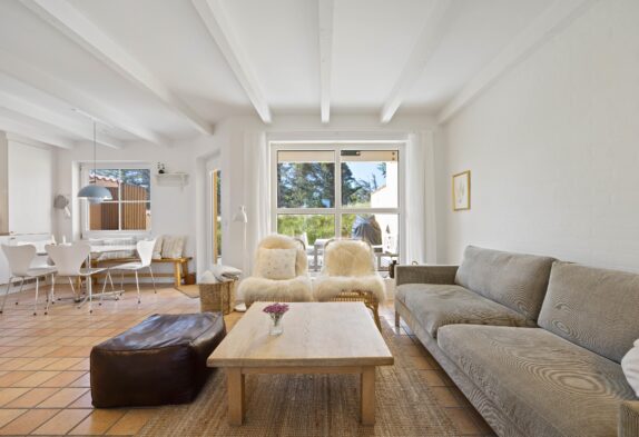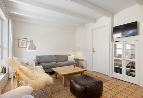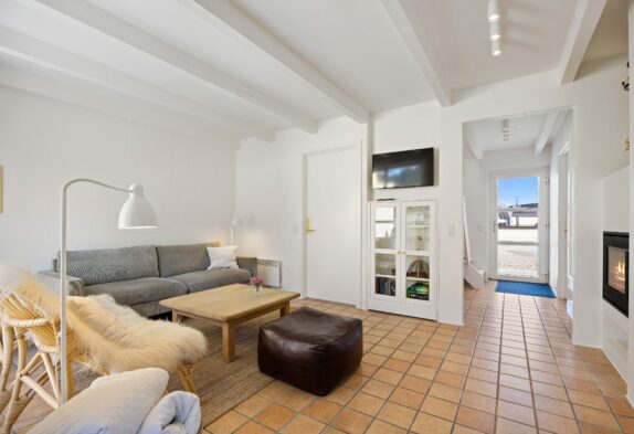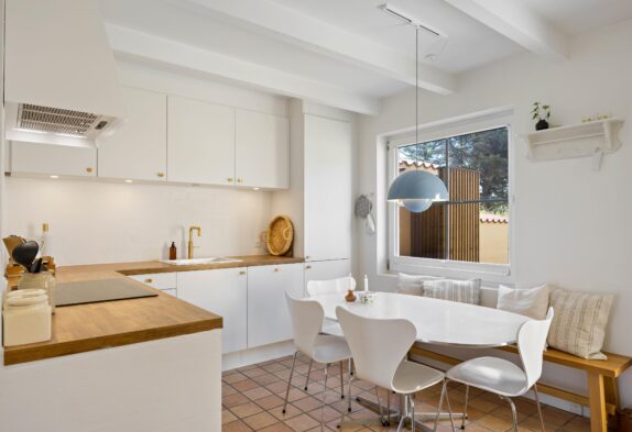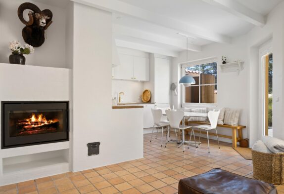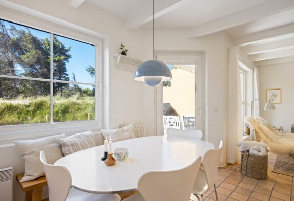 Ferielejligheden rummer et smukt, nyt, hvidt køkken, med alle de moderne faciliteter og har også quooker, så i hurtigt kan skolde sutteflasken, lave en kop the eller kaffe. Ubesværet kan i tilberede masser af nemt, lækkert feriemad, uden at bekymrer jer om opvasken, da opvaskemaskinen selvfølgelig klare dette for jer. Ydermere finder I en kombi vaskemaskine/tørretumbler i feriehuset, så I behøver heller ikke at bekymre jer om tøjvask under jeres ophold. I stuen er der lækre kurvestole og en skøn sofa, som indbyder til filmhygge, brætspil og kvalitetstid med familie og venner. Køkkenalrummet/stuen har en indbygget brændeovn, som I kan bruge til de lidt koldere dage eller blot for hyggens skyld. Ferielejligheden er indrettet med tre soveværelser, som alle sammen har et fantastisk lysindfald og den nordiske, hyggelige indretning går igen her. Der er også mulighed for at vælge, om man som forældre vil sove nedenunder og give børnene førstesalen, eller man kan som vennepar have en etage hver.