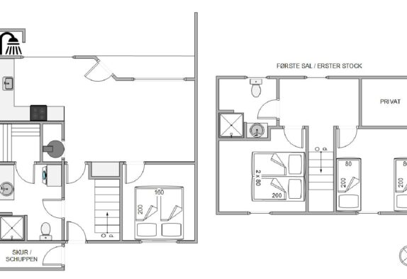 Ligeledes indeholder feriehuset også to badeværelser, et ovenpå og et nedenunder. Begge badeværelser er smukt renoveret, med flotte nye bademøbler, messingdetaljer og lækker rainshower bruser. Med et badeværelse på begge etager, giver dette igen også gode muligheder for at kunne indrette sig helt som man ønsker. Badeværelset nedenunder er også udstyret med gulvvarme.