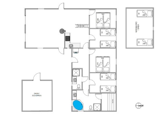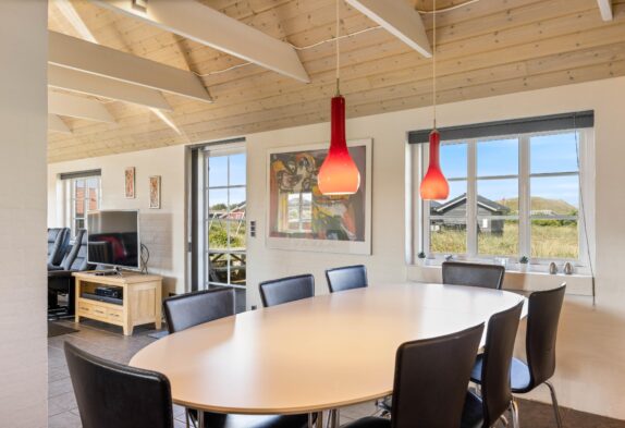 Det er intet bedre end at træde ind i et sommerhus og straks føle sig hjemme. Og det vil I med garanti gøre i dette skønne sommerhus i Houvig på Mågedalen 47, hvor stemning, materialer og beliggenhed går op i en højere enhed. Indretningen i huset fremstår lys og imødekommende, mens det gennemgående, mørke flisegulv i køkken, stue og badeværelse står som en flot kontrast til de lyse farver. Det praktiske flisegulv gør rengøringen til en leg. Også på dage, hvor der er ekstra meget sand mellem tæerne efter et besøg ved Vesterhavet. Loftet til kip bidrager til den store rummelighed i huset, der bliver udnyttet til fulde med en praktisk hems. På hemsen finder I 2 gode sengepladser, som der utvivlsomt vil være rift om blandt børnene. Hemsen får I adgang til fra en stige i stuen. Herudover er der yderligere 6 sovepladser fordelt på 3 værelser. Køkkenafdelingen er veludstyret med blandt andet mikroovn, opvaskemaskine og køleskab med en fryser på 90 liter.