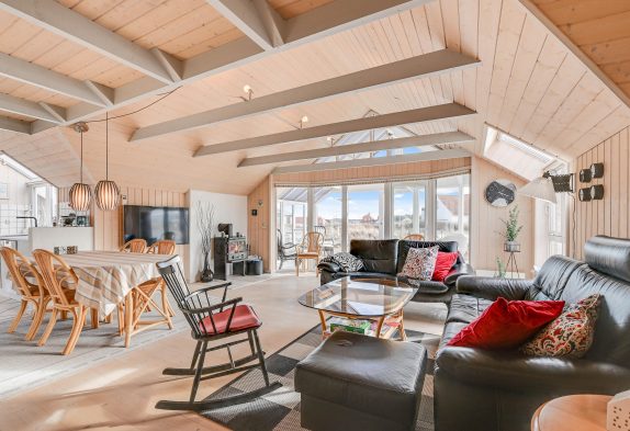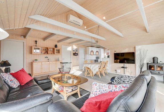 Fra køkkenet er der åbent til det store alrum, hvor I kommer til at tilbringe meget af jeres ferietid sammen. I det lyse rum er der lagt op til sjove stunder med spil omkring bordet eller gode film i sofaerne. Uanset, så sørger brændeovnen for at fuldende den hyggelige sommerhusstemning. Desuden opvarmes sommerhuset af en energivenlig varmepumpe.