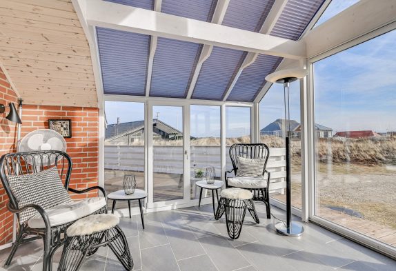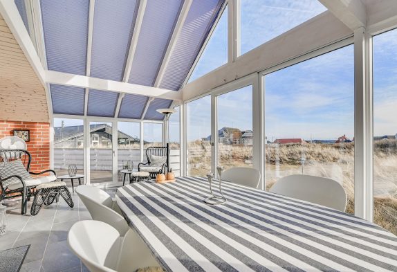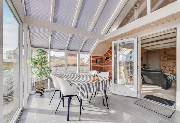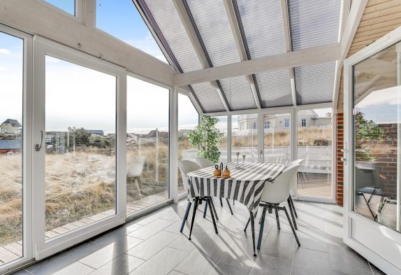 Hvis vejret ikke er med jer, men I gerne vil have oplevelsen af at sidde ude, kan I sætte jer i udestuen. Herfra har I en skøn udsigt til den omkringliggende natur, mens I sidder i komplet ly og læ. I udestuen har I desuden gulvvarme.