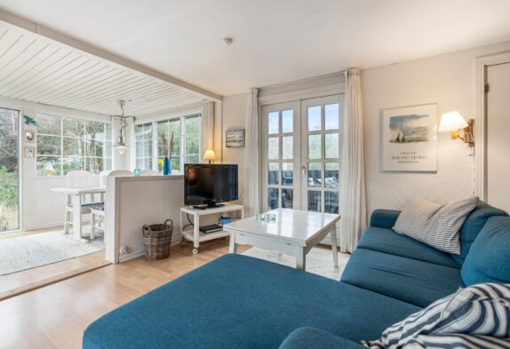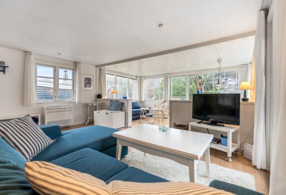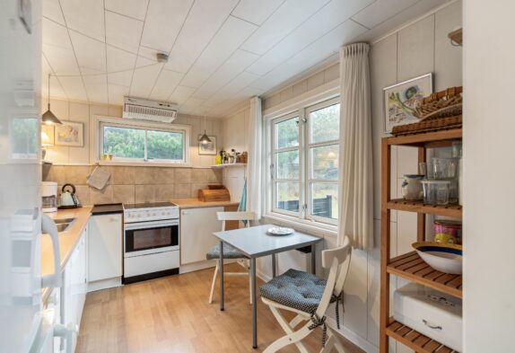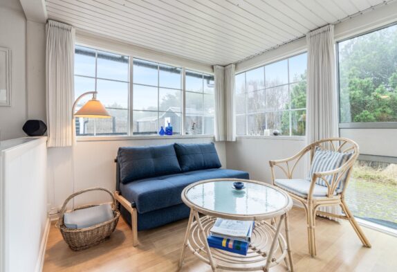 I dette lækre feriehus er der virkelig kælet for detaljerne. Her har man formået af tage beliggenheden nær Vesterhavet til sig og gøre det til en del af sommerhusets tema. Der hersker en næsten maritim stemning i huset, der blandt andet kan tilskrives de lyse vægge, de gennemgående blå nuancer og de stribede tekstiler. Elementer, der til sammen giver huset sin helt særegne personlighed. Alt i huset fremstår lyst og venligt. Stuen ligger i forbindelse med køkken og spiseplads og er indrettet med behagelige møbler, bløde tekstiler, brændeovn, TV, DVD, radio og CD. Fra stuen er der direkte udgang til udestuen, hvorfra I kan betragte den skønne natur gennem vinduerne. Huset har plads til 4 gæster, der kan gøre sig det behageligt i de 2 soveværelser. Det ene værelse er indrettet med dobbeltseng, mens det andet er udstyret med 2 enkeltsenge. Herudover er der et pænt badeværelse med bruseniche og gulvvarme.