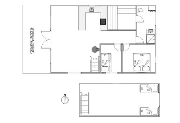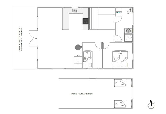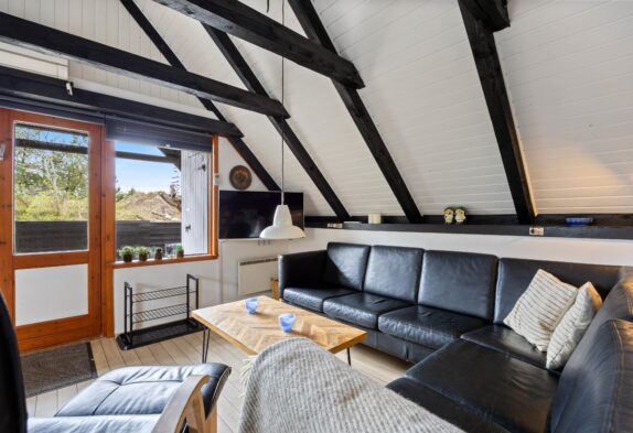 I feriehuset er der 2 soveværelser – 1 med køjesenge og 1 med en dobbeltseng. Derudover er der en hems, hvor der er plads til ekstra sovepladser – her vil børnene helt sikkert elske at overnatte på ferien. Sommerhuset har desuden 1 badeværelse med gulvvarme og adgang til saunaen, der altid står klar til at forkæle jer med en god gang afslapning.