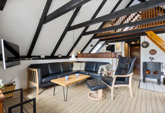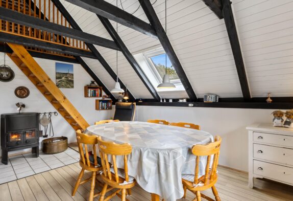 Opholdsstuen er det perfekte sted til alverdens hyggelige stunder sammen for parret eller familien. Her er der frithængende bjælker og loft til kip, der tilsammen gør det til et virkelig hyggeligt rum at være i. Hvad end I vil lave mad sammen eller samles i den store sofa til en god film i tv’et, kan I altid tænde brædeovnen, der fuldender hyggen.
