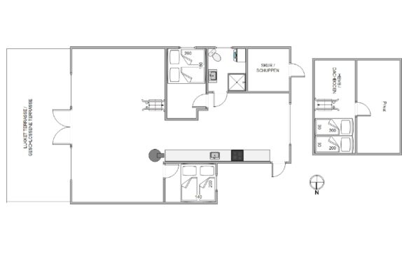Fra stuen er der direkte udgang til en skøn, renoveret østvendt terrasse, som er delvist overdækket og komplet aflukket. Det gør den ekstra attraktiv for børnefamilier og hundeejere, der dermed kan sikre at hverken små tobenede eller firbenede forvilder sig ud på eventur på egen hånd. Børnene kan endda fordrive tiden på grundens rutsjebane, der med garanti vil være et stort hit hos de små.   Huset er beliggende på en stille, blind vej, så I skal ikke frygte for generede trafik eller passerede gæster. Grunden er omkranset af sporadiske nåletræer og hybenbuske, der giver lidt ekstra privatliv – uden at spolere udsigten.   Området omkring sommerhuset er meget eftertragtet. Det skyldes ikke mindst den korte afstand til vandet. Havet ligger blot 350 meter fra grunden og kan nås på gåben i løbet af få minutter via de mange stisystemer, der findes omkring Houvig.