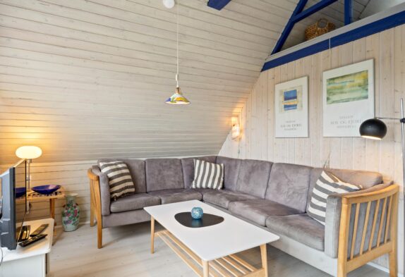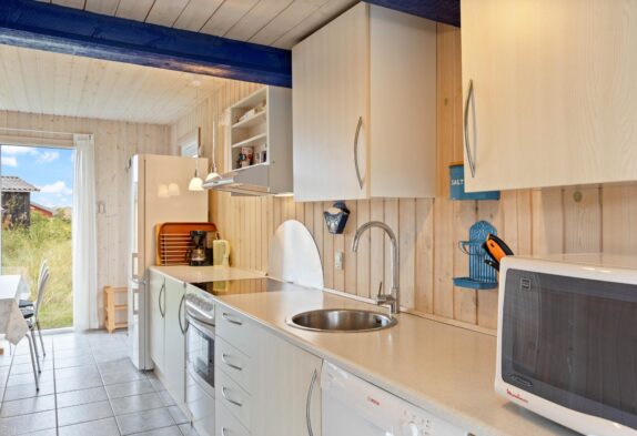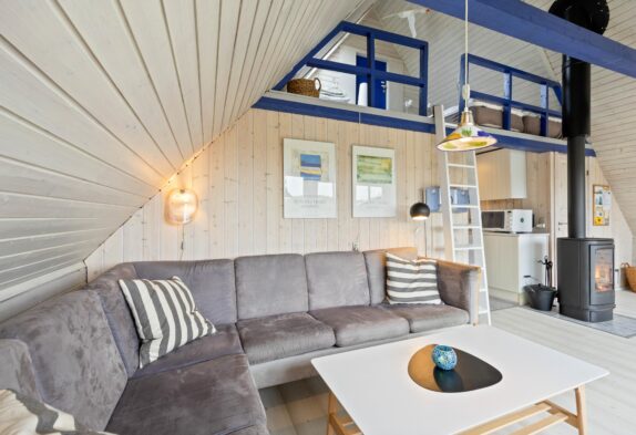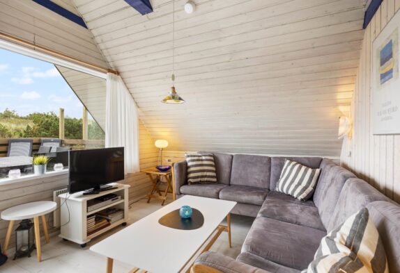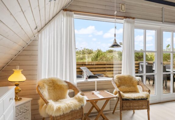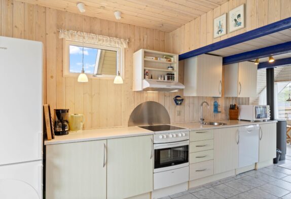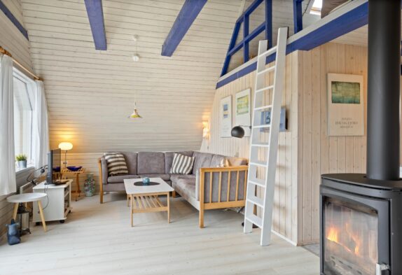Det er ingen tvivl om, at I kan nyde jeres velfortjente afbræk fra hverdagen i de skønne rammer i sommerhuset i Houvig. Her oser af klassisk sommerhuscharme, hvilket blandt andet kan tilskrives de panelbeklædte vægge, loftet til kip og de synlige loftbjælker. Og hvis det ikke er nok, skal den knitrende brændeovn og de store vinduespartier nok sørge for at banke stemningsbarometeret yderligere op. Har i ikke gang i i brændeovnen, har i en energibesparende lugt-til-luft varmepumpe til jeres rådighed, som bidrager til et behageligt indeklima hele året rundt.   Huset er lyst, venligt og godt indrettet. I stuen kan I slå jer ned i de bløde sofaer og zappe tv på fladskærmen, læne jer tilbage med en god bog eller nyde udsigten. I stuen finder I foruden tv’et samt radio- og CD-afspiller. Køkkenet er veludstyret med blandt andet mikroovn, opvaskemaskine samt køleskab med 90 liters frysekapacitet. I forbindelse med køkkenet er der en dejlig spiseafdeling med vindue mod vest. Herfra er der udgang til en lille vestvendt terrasse.   I sommerhuset finder I 2 gode værelser, der begge er indrettet med behagelige dobbeltsenge. Herudover er der en hems, hvor der er plads til yderligere 2 sovende gæster. Dertil kommer et lyst og venligt badeværelse med bruseniche og gulvvarme.