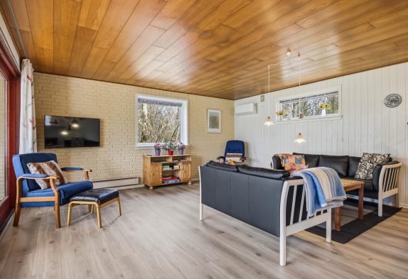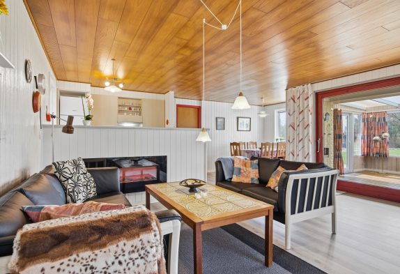 Det charmerende sommerhus i Lodbjerg Hede er indbegrebet af hyggelig sommerhusstemning. Her kan I slappe af i de bløde sofaer, der kalder på at blive indtaget til boglæsning eller en lille lur. Sofagruppen har direkte udsyn til den hyggelige udestue, der er ideel til at nyde morgenens første kop kaffe.