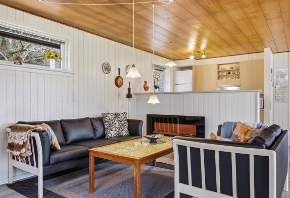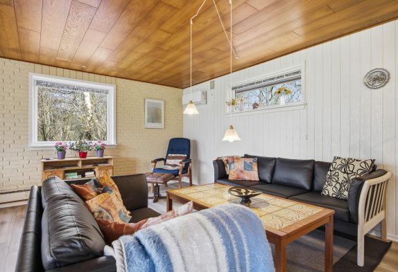 Vægge såvel som loft er beklædt med paneler, der bidrager til en rolig og huleagtig atmosfære, som vil bekomme de fleste vel. Huset føles trygt og roligt, og jeres puls vil formentlig dykke et par slag under jeres ophold her.