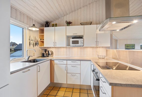 Der er virkelig skruet op for hyggen i det velholdte sommerhus i Houvig. Det skyldes ikke mindst den knitrende brændeovn, de bløde sofaer, loftet til kip og de panelbeklædte vægge. Alle klassiske sommerhuselementer, der bidrager til den hyggelige atmosfære. Den dejlige stue er indrettet med gode kvalitetsmøbler, hvor I med sikkerhed har lyst til at smække benene op. Herfra kan I nyde varmen fra brændeovnen og den flotte udsigt gennem vinduerne. Hvis I ikke ønsker at tænde op i brændeovnen, har feriehuset tilknyttet en varmepumpe, hvor I også kan nyde varmen fra. Eller I kan sætte en film i DVD-afspilleren og se en god film. Gerne med en stor portion popcorn i skødet. Sommerhuset har i alt 8 sovepladser fordelt på 4 værelser. 2 af værelserne er indrettet dobbeltsenge, mens de sidste 2 værelser er udstyret med hver 2 enkeltsenge. I finder et stort badeværelse i feriehuset, hvor der virkelig er skruet op for wellness-elementerne. Badeværelset er nemlig udstyret med både spabad og sauna, ligesom det også har brusekabine, tørretumbler, vaskemaskine og gulvvarme. Derudover er der desuden et gæstetoilet med brusekabine og gulvvarme.