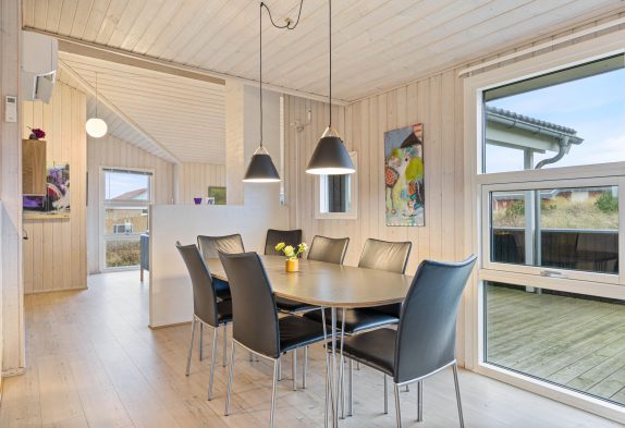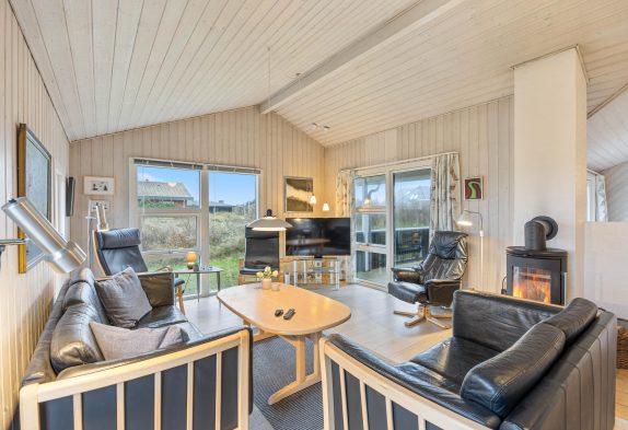 Sommerhuset er beliggende på en dejlig naturgrund, hvor hybenbuske og marehalm snor sig lystigt. Og I vil helt sikkert have lyst til at slå jer ned på en af feriehusets terrasser for at nyde udsigten og den friske havluft fra Vesterhavet. På terrassen kan I virkelig slappe af og komme ned i gear. Den er lukket og delvist overdækket, så I både kan blive skærmet for vind og vejr og nyde solens stråler fuldt ud. Der er naturligvis både havemøbler, liggestole og grill til rådighed, så de hyggelige grillaftenener er sikret. Den lukkede terrasse forhindrer desuden, at mindre børn eller familiens hund forvilder sig ud på eventyr på egen hånd. I skal selvfølgelig heller ikke snyde jer selv for et besøg til Vesterhavet, der kun ligger 300 meter fra adressen. Området mellem sommerhuset og vandet byder på en masse små stier i klitterne og en skøn naturflora, der er værd at udforske på jeres traveture.