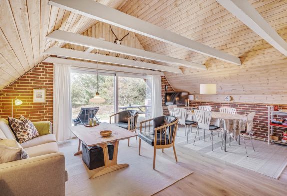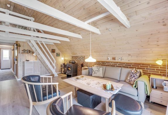 Soveværelser til alle familiens medlemmer på Brunbjergvej 45Selvom huset ikke er stort, syner det ikke lille. Det skyldes i høj grad loftet til kip og de store åbne vinduespartier, der giver den gode, åbne rumlighedsfølelse. Pladsen til loftet er praktisk udnyttet med en lille hems, hvor der befinder sig en indbydende dobbeltseng samt sofabord og lænestole. Rummet er oplagt til forældresoveværelse på familieferien.