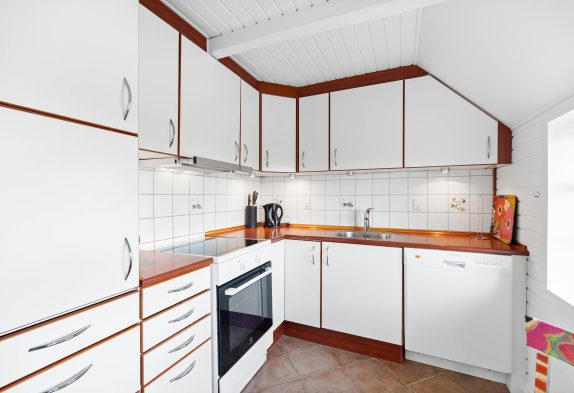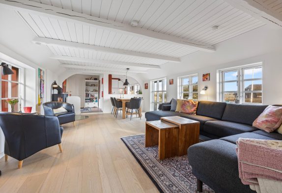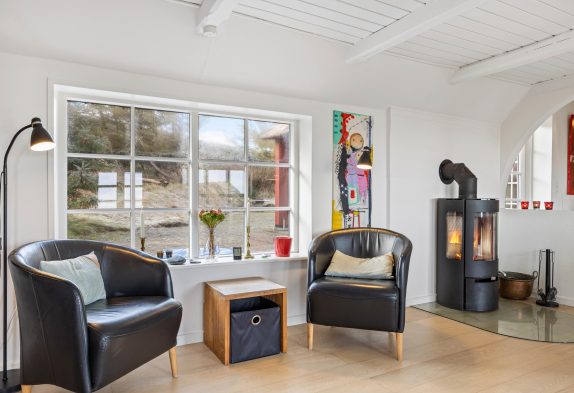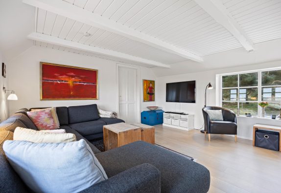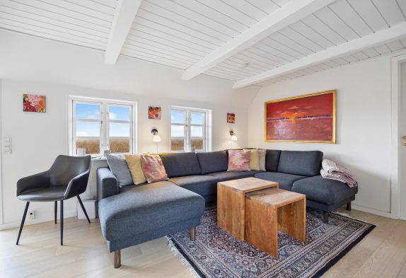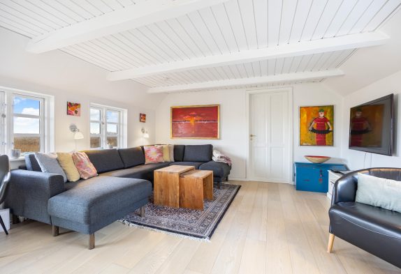 Det sker noget med en, når man træder indenfor i det skønne sommerhus i Houvig. I vil uden tvivl straks føle jer hjemme i de hyggelige omgivelser og mærke pulsen falde et par niveauer. Her hersker en særlig stemning af nostalgi og sjæl, hvilket ikke mindst skyldes den personlige indretning. Her er der nemlig flot kunst på væggene, bløde og farverige tekstiler, behagelige møbler og fritlagte bjælker. Alt sammen små detaljer, der er med til at danne det samlede billede af en hyggelig atmosfære. Men selvom huset er fra 1820, skal I på ingen måde frygte at gå ned på komfort. Huset har gennemgået en komplet renovering og fremstår yderst moderne og indbydende.