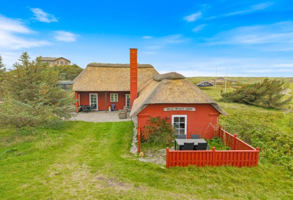 I vil tydeligt mærke, hvordan Vesterhavet ligger lokkende i baggrunden. Og lyden af de brusende bølger vil uden tvivl være et skønt og afslappende lydtapet under jeres ophold. Med kun 100 meter til Vesterhavet vil I helt sikkert få akut behov for daglige dyp i vandet. Selve beliggenheden er ikke kun ideel på grund af den nærliggende strand. Den smukke naturgrund er også et kapitel for sig selv. Den ligger en smule tilbagetrukket i en lille lomme, så I kan nyde jeres egen lille oase. Rundt om grunden står knejsende nåletræer, der fungerer som en smuk baggrund, der tillige skærmer for vind og vejr. Den hyggelige delvis lukkede terrasse bidrager til samme romantiske bondegårdsidyl, som resten af det røde stråtækte hus. Her kan I nyde morgenkaffen i selskab med strunke stokroser, svajende græsser og sødmefyldte hybenbuske. Mere idyllisk bliver det næppe. Derudover har de mindre børn mulighed for en dejlig gyngetur.