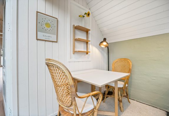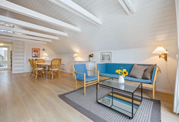 Sommerhuset er indrettet med to gode soveværelser samt en hems med dobbeltseng. I sommerhuset finder I også et lyst og lækkert badeværelse med opvarmet flisegulv. Og hvis en i familien spiller klaver, står der i stuen et klaver, I frit kan benytte.