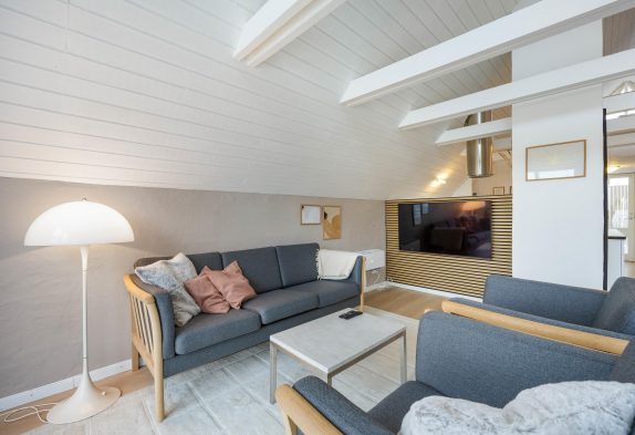 Indretningen gennem hele sommerhuset er lyst og indbydende med et yderst stilfuldt præg. I stuen er der store vinduespartier, der giver et fantastisk lysindfald. Sommerhusets hjerte er det store alrum, hvor loft til kip og den gode indretning tilsammen skaber en hyggelig atmosfære. Det er her hele familien samles og kan nyde kvalitetstid over et spil brætspil.