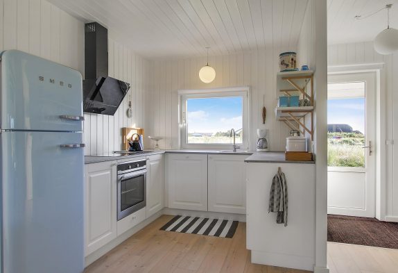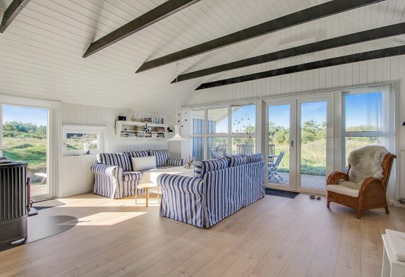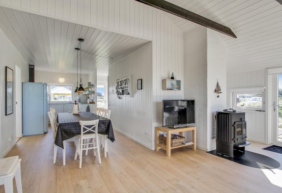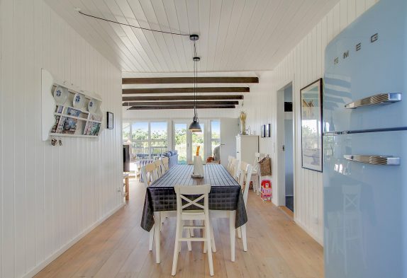 De lyse trævægge og det høje loft til kip kombineret med de særdeles smagfulde møbler er med til at give huset et romantisk pust, så I straks føler jer hjemme og kan mærke feriestemningen. Samtidig er indretningen præget af fine detaljer, såsom blåstribede sofaer, et lyseblåt SMEG-køleskab og små detaljer med drivtømmer, der giver huset en næsten maritim stemning. Meget passende for et hus, der ligger så nær vandet. Sommerhuset har en god rumfordeling med stor opholdsstue og 3 gode værelser. 2 af disse værelser er indrettet med dobbeltsenge, mens det sidste værelse har 2 enkeltsenge. Men husets hjerte er uden tvivl det store opholdsrum med loft til kip og store vinduespartier, der inviterer lyset indenfor. Her er det plads til både aktivitet og afslapning – de to vigtigste ingredienser, når man holder ferie.