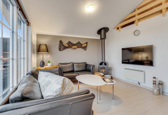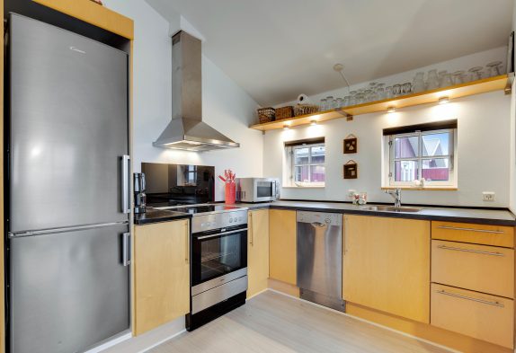 I sommerhusets alrum, hvor køkken og stue er forenet, kan I tilbringe mange hyggelige feriestunder sammen. Omkring spisebordet kan I samles til skønne måltider, og efterfølgende kan I sætte jer til rette i de komfortable sofaer foran fjernsynet og se en god film sammen. Brændeovnen skruer op for varmen og feriestemningen. I alrummet er der også en hems, der er et sikkert hit blandt de yngste feriegæster.